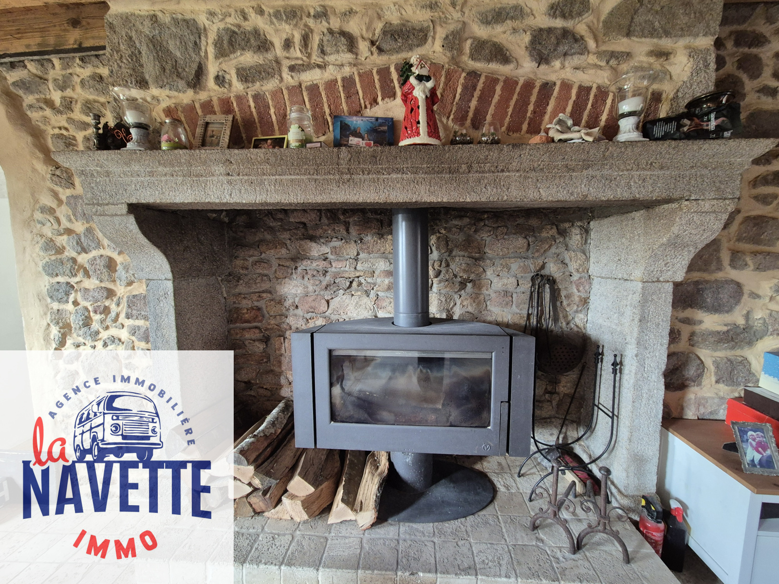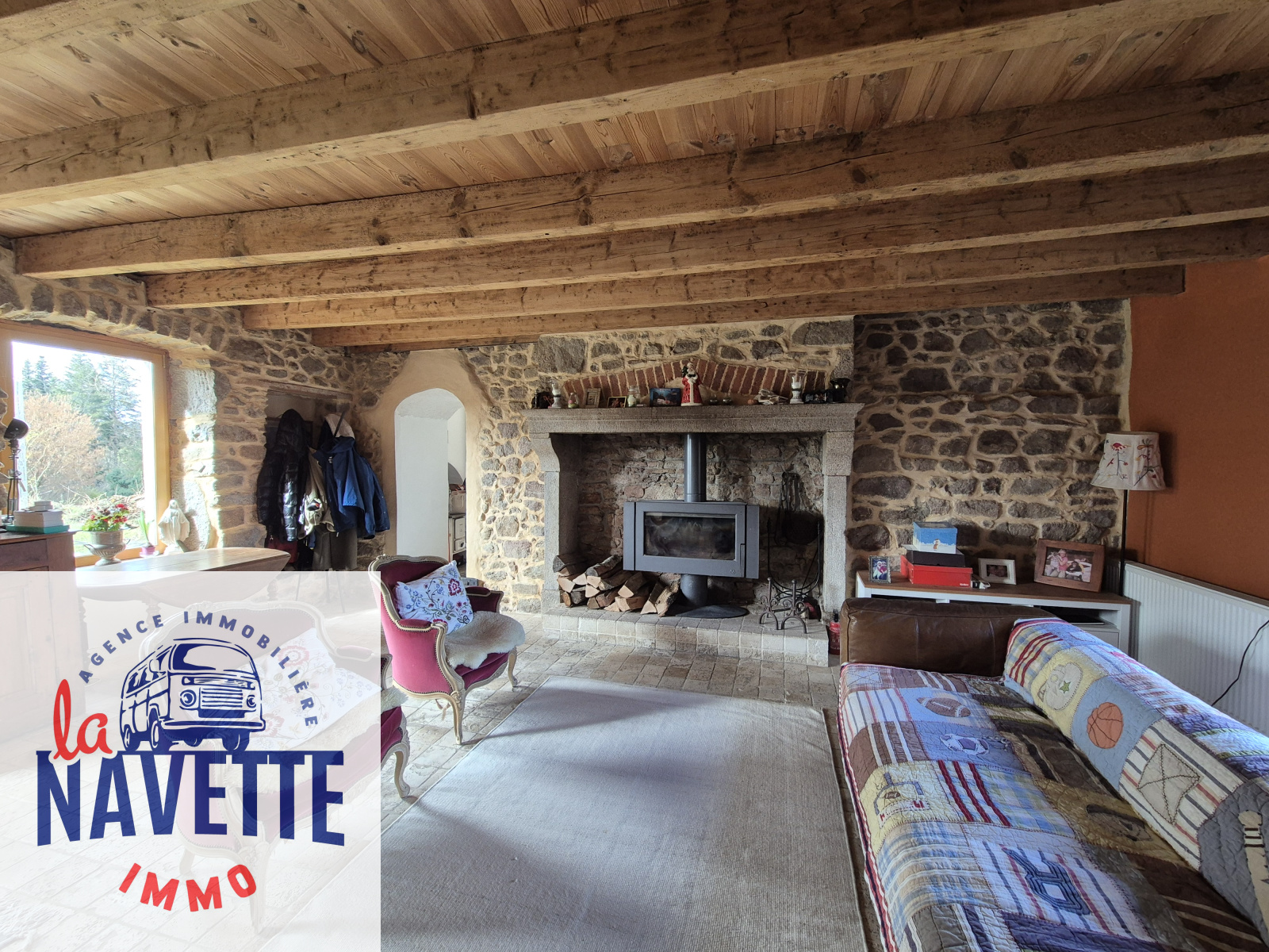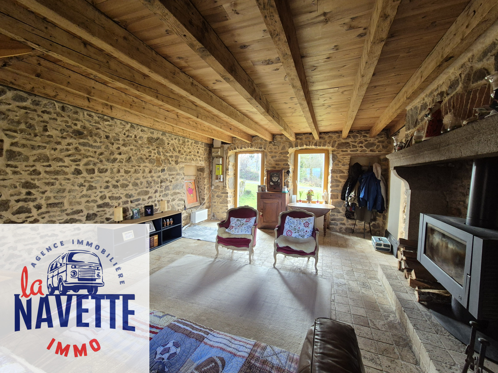 Au rez-de-chaussée, vous trouverez une cuisine spacieuse et lumineuse équipée d’un poêle à bois, ainsi qu’un salon chaleureux de plus de 30 m² avec pierres apparentes, idéal pour des moments conviviaux.